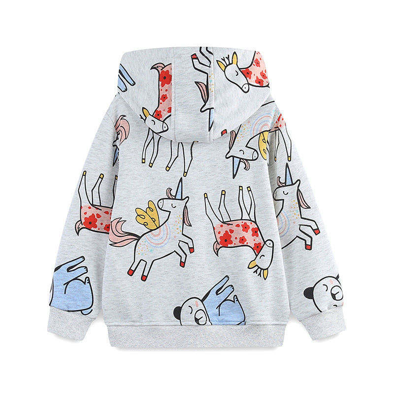 Made from 70% cotton knitted fabric with soft cotton lining, this sweatshirt ensures softness, warmth, and durability for daily wear. The long sleeves, hooded design, and front zipper closure make it perfect for school, casual outings, or outdoor play, while the charming cartoon print adds a playful and trendy touch.