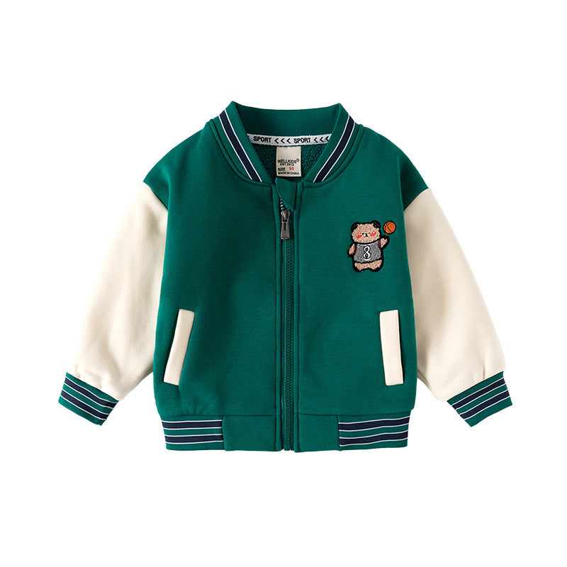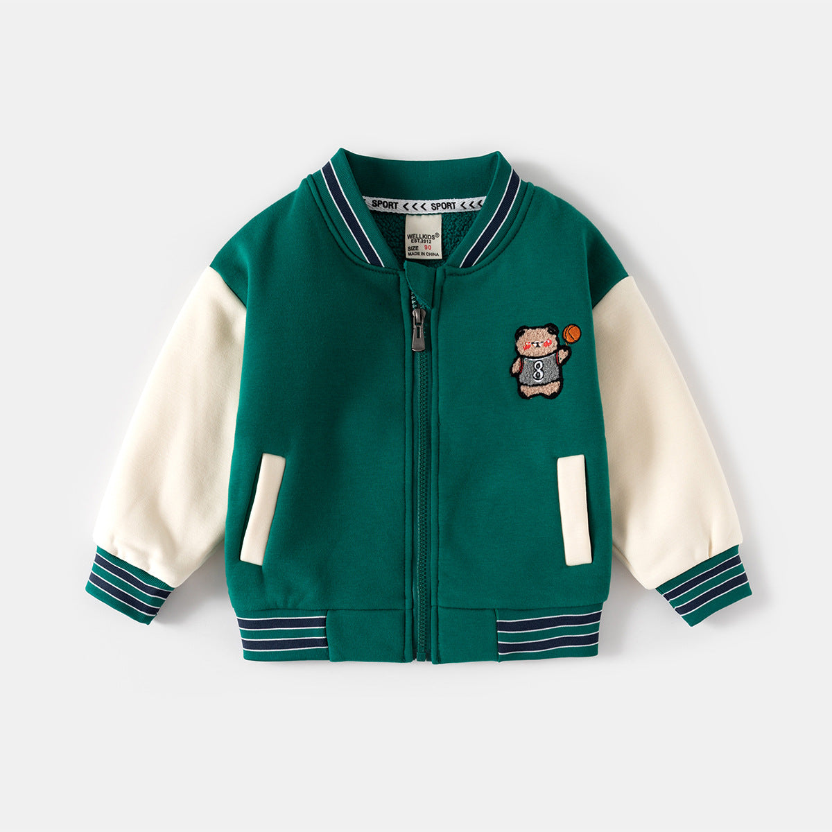 Boys' Fleece Baseball Jacket - Cartoon Embroidery, Zip-Up, Non-Hooded