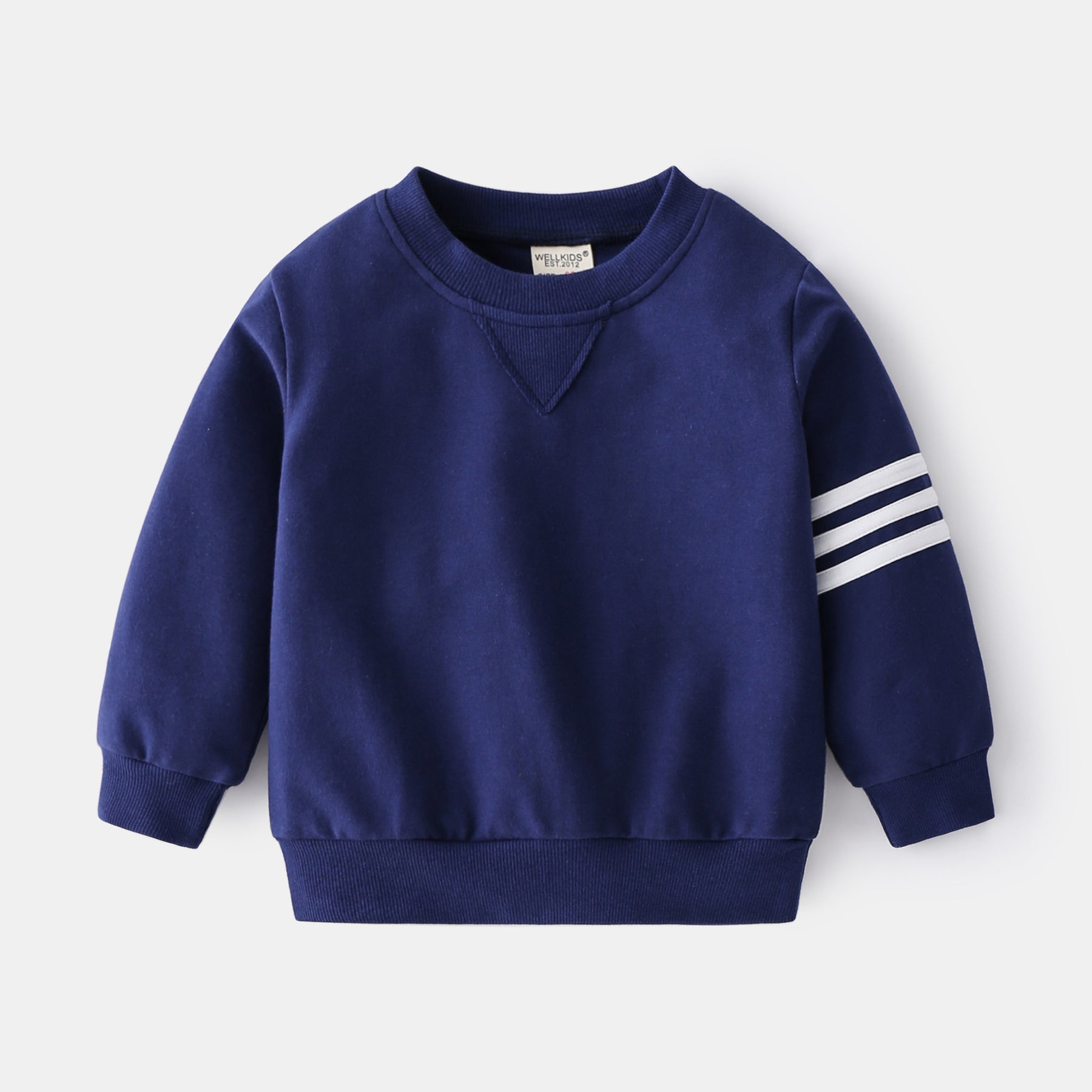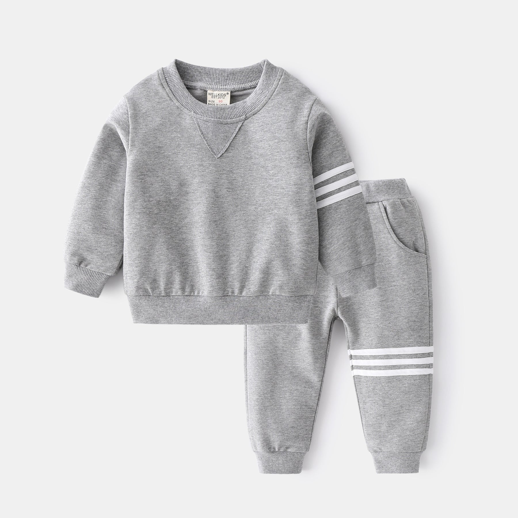 Available in classic navy blue and versatile gray, the Wellkids Sports Suit features a solid color design with striped accents for a touch of sporty flair. Its long sleeves and trousers provide warmth during the transitional seasons of spring and autumn.