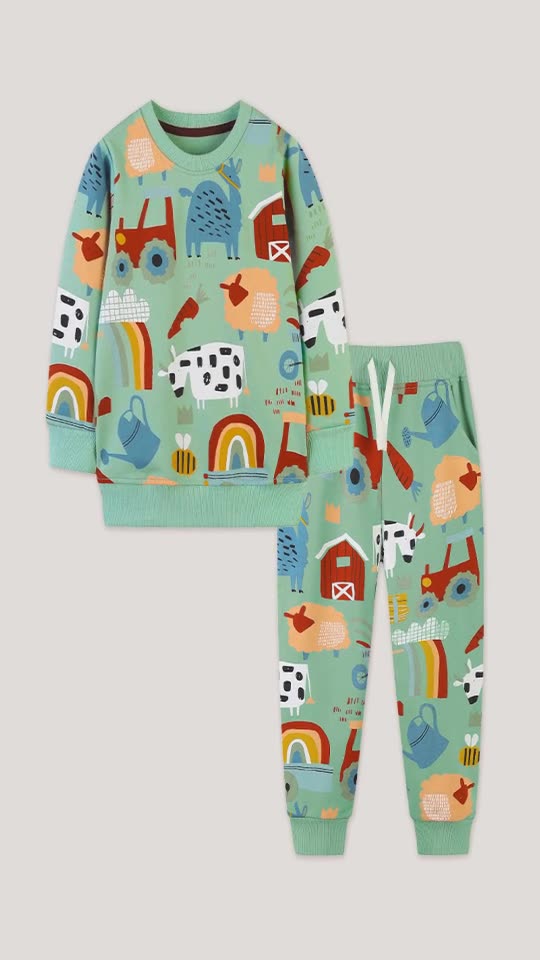 This boys’ cotton sweatshirt and pants outfit combines fashion with comfort, making it a must-have choice for children who love playful prints and active wear.