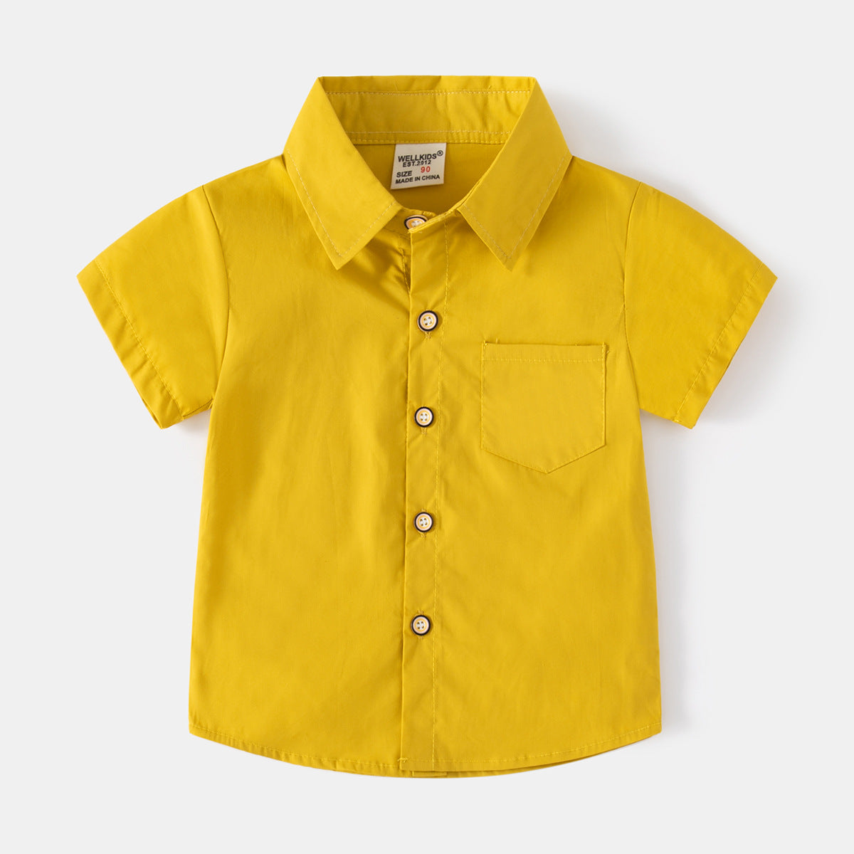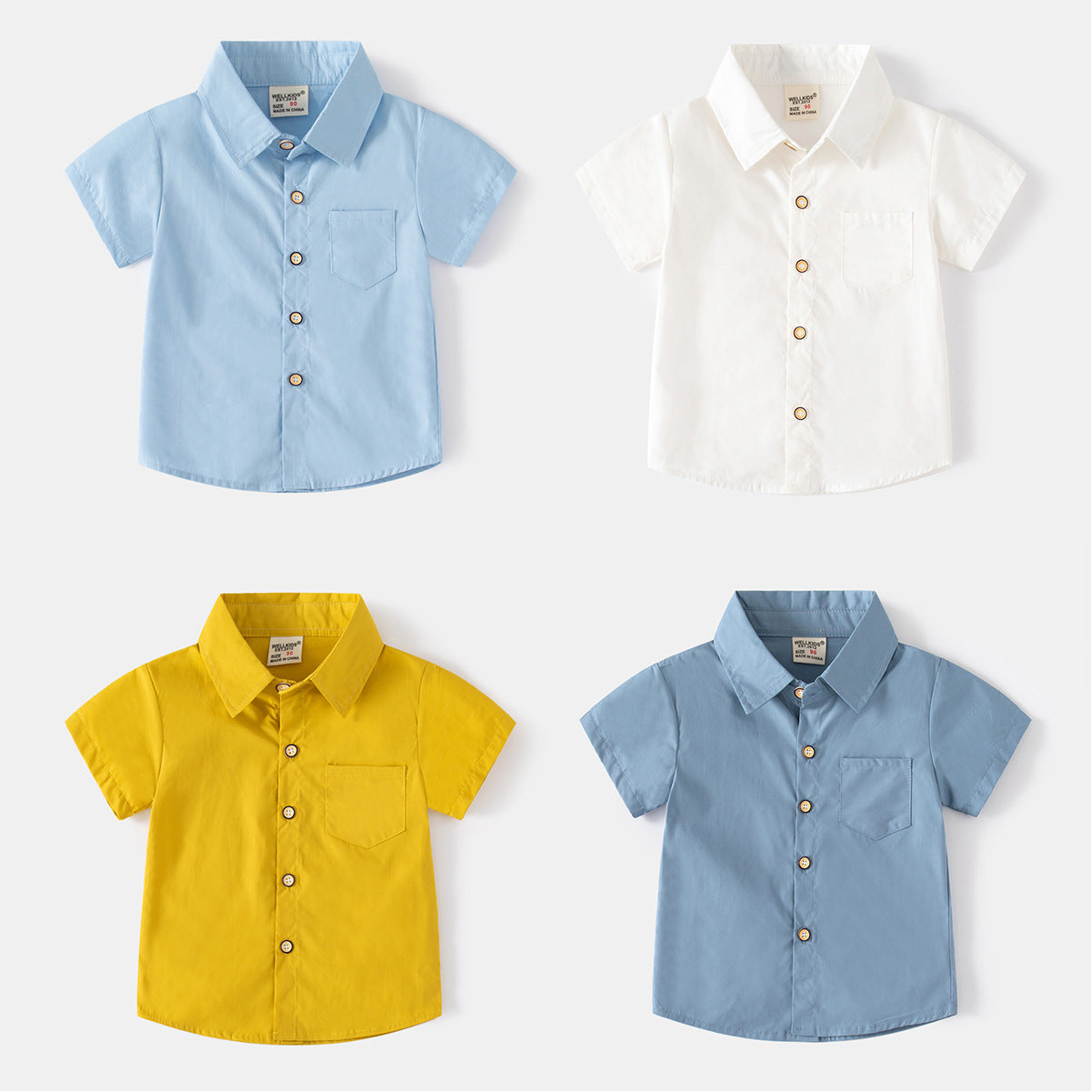 Designed specifically for boys aged 3 to 8, this shirt is crafted from 100% soft cotton, ensuring a gentle touch on your child's skin. With a trendy turn-down collar and a solid color pattern, it's the ideal choice for any casual summer outing.