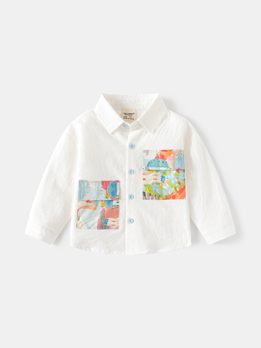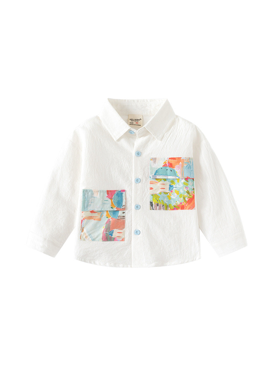 Made from 100% premium cotton, this garment ensures softness and durability, making it ideal for active kids. The long sleeves and lapel collar add a touch of sophistication, while the abstract patterns and irregular graffiti pockets bring a fun, artistic flair.